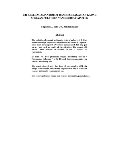 Masukkan kcl 4,38 g larutkan dengan aqua pi secukupnya. Obat dibuat dalam berbagai bentuk (sediaan) seperti yang akan di bahas dalam laporan ini yaitu serbuk terbagi (pulveres), potio untuk pemakaian dalam,dan obat gosok (liniment), salep (unguenta) untuk pemakaian luar badan. Biografi kyai haji hasyim asy ari. Serbuk terbagi (pulveres) serbuk tidak terbagi (pulvis) 1. Serbuk terbagi (pulveres) adalah serbuk yang dibagi dalam bobot yang kurang lebih sama yang dibungkus menggunakan bahan pembungkus yang cocok dan digunakan untuk sekali minum (dosis tunggal). laporan praktikum farmasetika i suspensi trisuspen disusun oleh : Related books free with a 30 day trial from scribd. Pelaksanaan praktikum farmasetika dasar program studi s1 farmasi universitas gunadarma yang meliputi penimbangan bahan obat, kelengkapan resep, skrining resep, pembuatan salinan resep dan verifikasi obat, resep dan pembuatan sediaan pulveres, pulvis adspersorius, kapsul, salep, dan pasta. laporan praktikum kuliah sediaan farmasi dan terapi umum serbuk terbagi (kapsul) anggota kelompok : 19 maret 2010 dosen pengampu : Tujuan praktikum kali ini adalah untuk mengenal cara pembuatan pulvis denga ketentuan syarat pulvis yang baik, dengan peracikan yang benar dan penggunaan etiket biru. Dalam praktikum kali ini dokter meminta sediaan obat dalam bentuk pulveres (serbuk terbagi). Uji stabilitas fisik sediaan racikan pulveres di beberapa, uji keragaman bobot pulveres untuk penyakit infeksi, laporan praktikum pengenalan alat teknologi formulasi, keseragaman bobot resep racikan serbuk bagi pulveres di, pdf formulasi dan uji fisik sediaan suppositoria ekstrak, formulasi sediaan