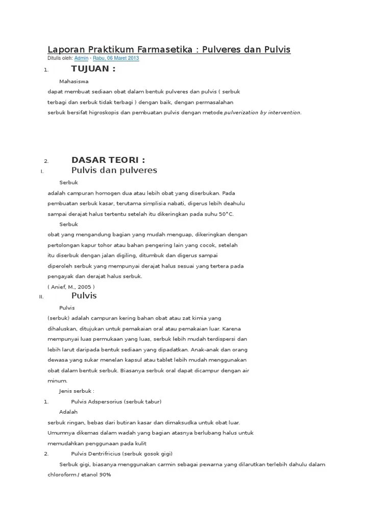 Laporan Praktikum Pulveres / Laporan Praktikum Farmasetika Pulvis Dan Pulveres Seputar Laporan - Serbuk diracik dengan cara mencampur bahan obat satu persatu, sedikit demi sedikit dan dimulai dari bahan yang jumlahnya sedikit kemudian diayak, biasanya menggunakan pengayak no.. Resep yang mengandung narkoba harus. Salah satu syarat serbuk bagi (pulveres) yang baik yaitu harus memenuhi persyaratan. Anasthasia pujiastuti, s.farm., apt laboratorium teknologi farmasi akademi farmasi theresiana semarang 2010 Contoh laporan praktikum ilmu resep bab i. Ini dalam bentuk maupun isinya yang sangat sederhana.